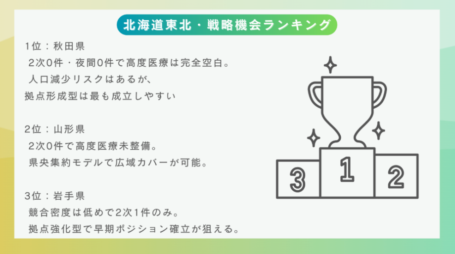 北海道では札幌を中心に医療機能が集積している一方で、東北では高度医療や夜間医療の体制が十分とは言えない県も多く存在しています。