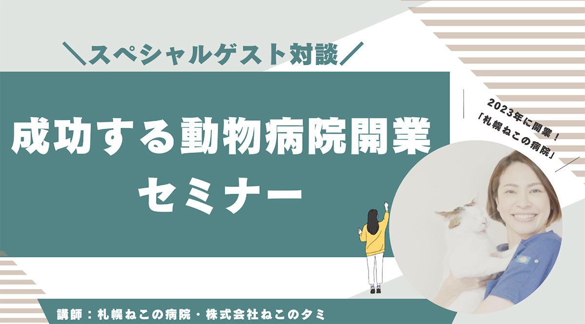 【札幌ねこの病院】スペシャルゲスト対談開業セミナー 2026.2.4 セミナー情報 【札幌ねこの病院】スペシャルゲスト対談開業セミナーSapporo Cat Hospital: Special Talk実際開業された「札幌ねこの病院西谷様」を迎えの開業エピソードを踏まえたセミナーを実施。一から開業する苦悩や女性のライフスタイルに合わせた開業について語って頂いています。 前の記事へ 一覧へ戻る 次の記事へ